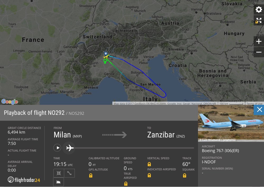 Martedi sera questo volo NO/NOS292 da #Milano Malpensa a Zanzibar appena sorvolata Ancona ha compiuto una virata a destra ed e’ ritornato a Malpensa. Il bireattore della #Neos ha effettuato alcune holding sulla pianura padana a ovest di #Malpensa prima di atterrarci. Si parla di una piccola avaria ad un componente di uno dei due propulsori. Non appare che sia stata di differente natura, anche perché la stampa non ne ha parlato di una diversione ad esempio medica. Successivamente la stessa sera ha preso di nuovo il volo per #Zanzibar – #Mombasa.