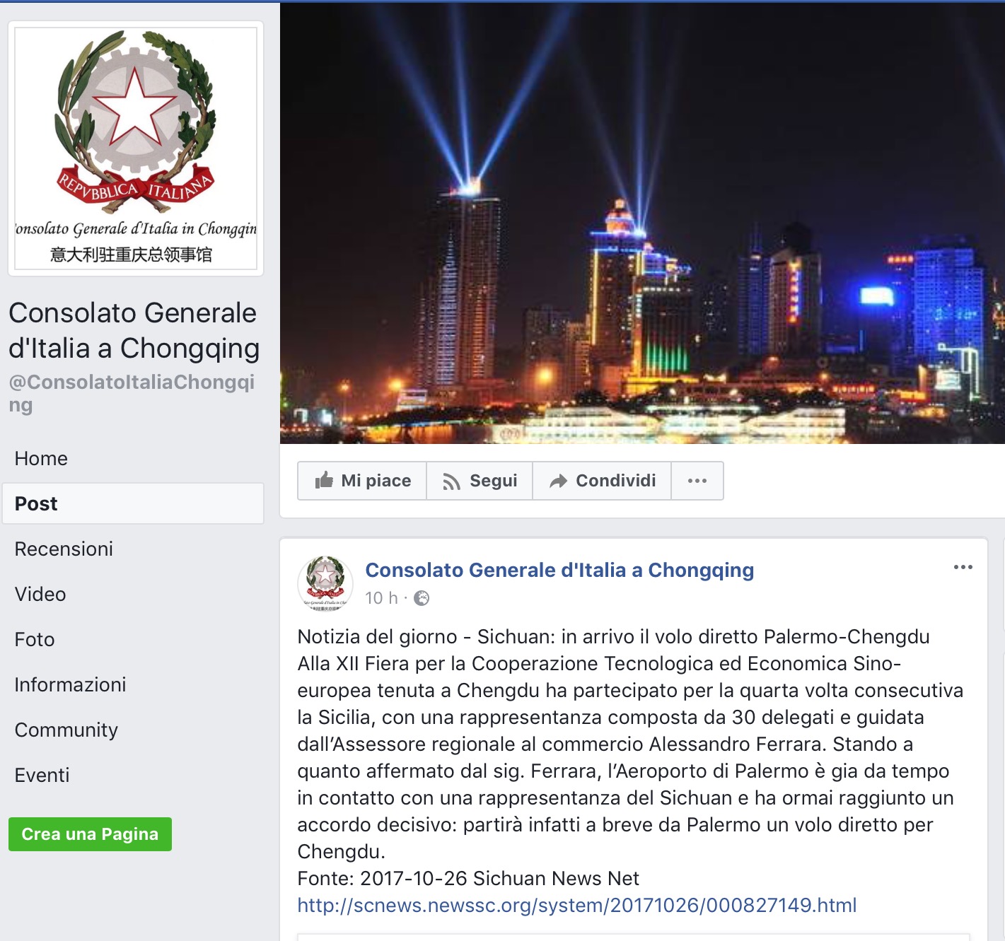 Con questo post sulla pagina del Consolato Generale d’Italia di #Chongqing riferisce una notizia del Sichuan News Net dove si afferma che l’Assessore Regionale al Commercio Alessandro Ferrara della Regione Sicilia ha dichiarato che l’aeroporto di Palermo sarà presto collegato con un volo diretto tra #Palermo e #Chengdu.