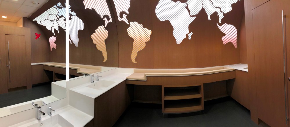 In tale ottica è stato realizzato un ambiente accogliente e confortevole, con richiami al tema del viaggio attraverso i disegni di aerei dalla forma arrotondata con la loro simbolica scia sulle pareti d’ingresso, un grande specchio che amplifica la sensazione dello spazio interno, un planisfero stilizzato e retroilluminato con luci a led e incastonato nel legno che sormonta l’ampio fasciatoio, che può ospitare fino a tre neonati contemporaneamente e con annesso portapannolini, spazi sottostanti per le valigie, wc adatti all’uso da parte di bambini piccoli, due lavabo con ripiani in corian (detto anche “pietra acrilica”) di cui uno basso per consentire anche ai piccoli di praticare in modo autonomo l’igiene delle mani e del viso. La nursery è stata progettata con l’intento di ricreare l’atmosfera casalinga, mettendo a disposizione l’accessibilità e la praticità di cui le mamme hanno bisogno e permettendo ai piccoli passeggeri di farsi catturare dall’atmosfera dell’incanto e dell’immaginazione.