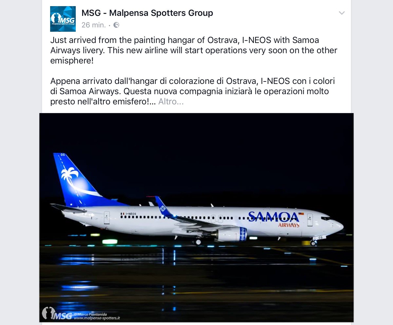 compagnie aeree, rotte A Malpensa il B737/800 Samoa Airways by Neos Pubblicato da Italiavola il 6 novembre 2017 Eccolo a #Milano #Malpensa l’aereo che presto volerà a Western Samoa per volare da #Apia #Faleolo con Samoa Airways. E il Boeing 737/86N I-NEOS della #Neos. #WesternSamoa #SamoaAirways Condividi: Fai clic per condividere su Facebook (Si apre in una nuova finestra) Facebook Fai clic qui per condividere su LinkedIn (Si apre in una nuova finestra) LinkedIn Fai clic qui per condividere su Reddit (Si apre in una nuova finestra) Reddit Fai clic qui per condividere su Pinterest (Si apre in una nuova finestra) Pinterest Fai clic qui per condividere su Tumblr (Si apre in una nuova finestra) Tumblr Fai clic per condividere su X (Si apre in una nuova finestra) X Mi piace Caricamento... Correlati