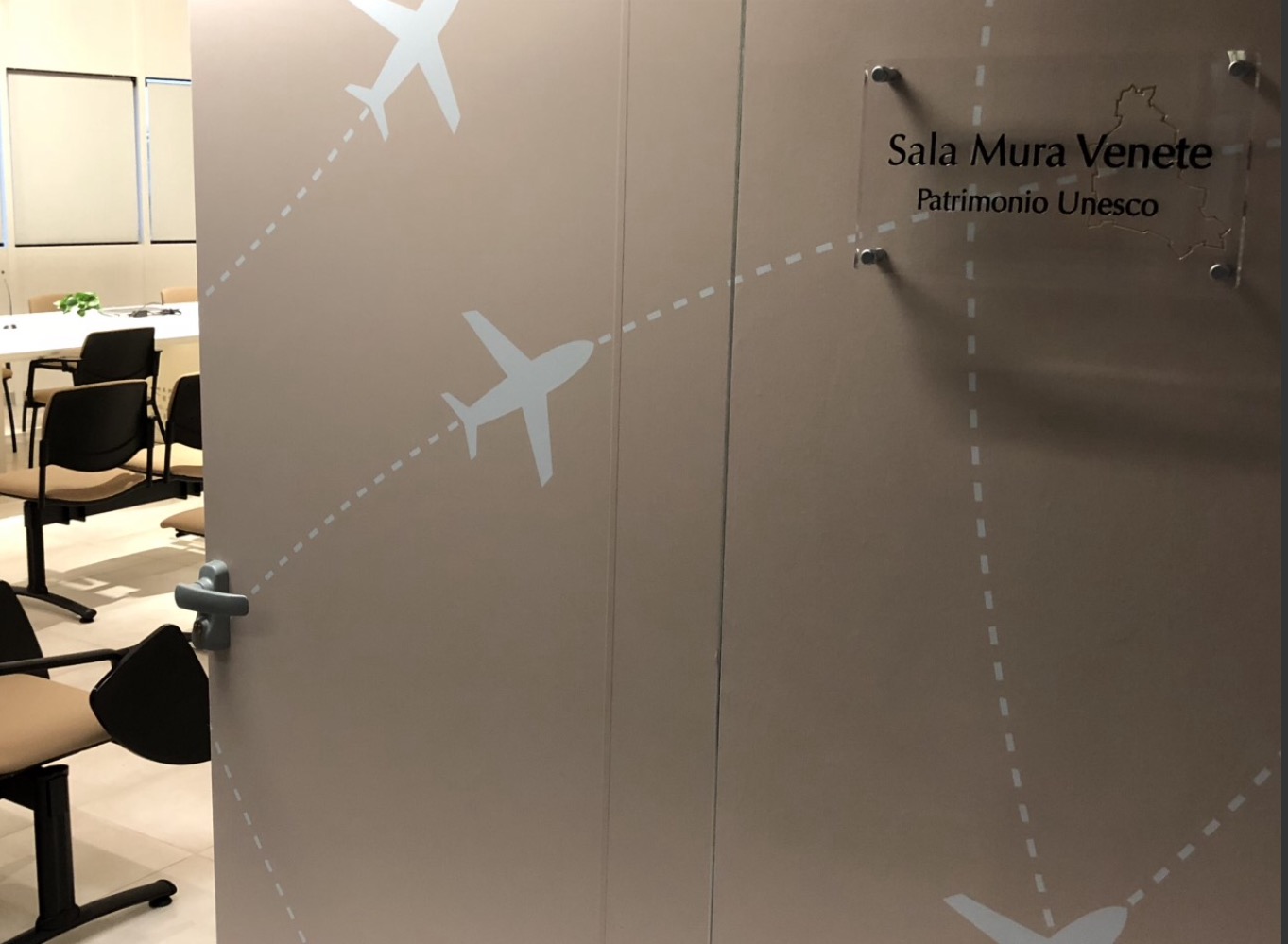 Lo staff Progettazione, Costruzione e Manutenzione Infrastrutture Edili di #SACBO è intervenuto per rivisitare gli spazi e renderli più funzionali, modificando la sistemazione delle sedute e predisponendo le pareti per intonarle alla nuova denominazione: Sala delle Mura Venete.