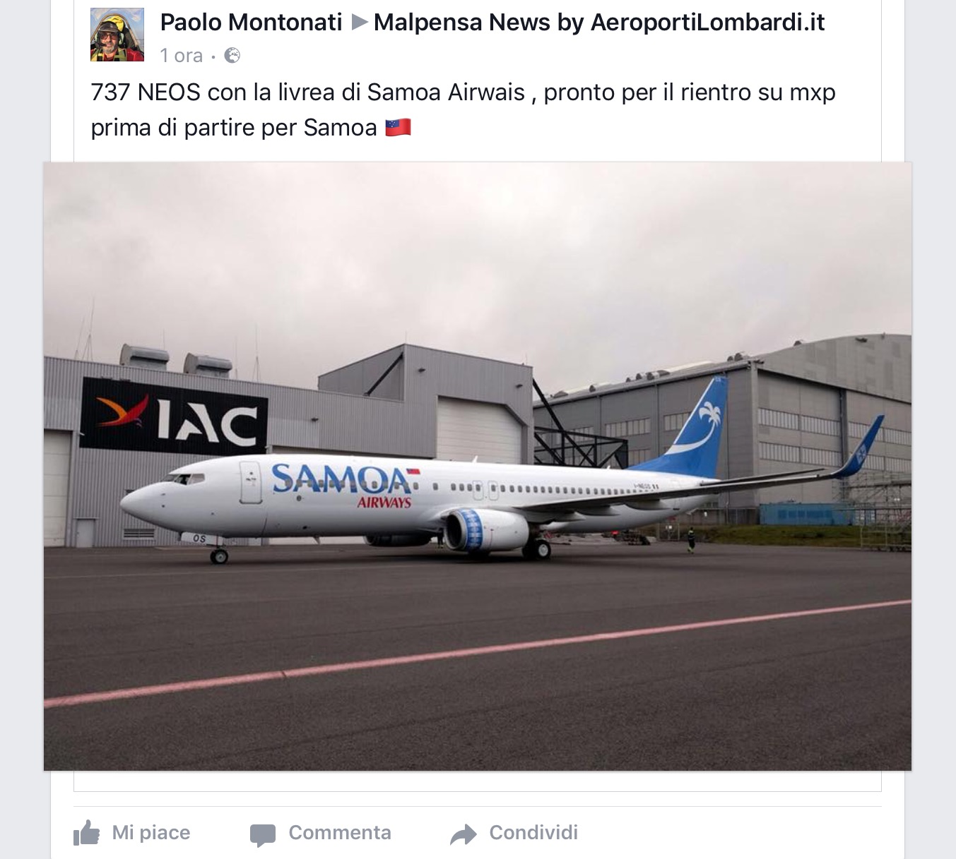 compagnie aeree, rotte Et voila! Il B737/800 Samoa Airways by Neos Pubblicato da Italiavola il 6 novembre 2017 Eccolo il B737/86N I-NEOS della #Neos con i colori Samoa Airways che in serata da #Ostrava arriverà a #Malpensa! L’aereo in settimana partirà per #Apia da #Milano #Malpensa. #SamoaAirways #Neos Condividi: Fai clic per condividere su Facebook (Si apre in una nuova finestra) Facebook Fai clic qui per condividere su LinkedIn (Si apre in una nuova finestra) LinkedIn Fai clic qui per condividere su Reddit (Si apre in una nuova finestra) Reddit Fai clic qui per condividere su Pinterest (Si apre in una nuova finestra) Pinterest Fai clic qui per condividere su Tumblr (Si apre in una nuova finestra) Tumblr Fai clic per condividere su X (Si apre in una nuova finestra) X Mi piace Caricamento... Correlati