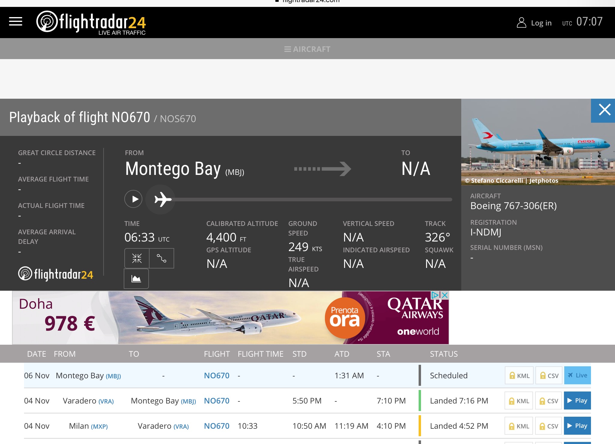 E’ ripartito da poco più di un oretta, con un oltre un giorno di ritardo il B767-306ER Neos I-NDMJ che dopo l’atterraggio nella serata di sabato sera non era più ripartito da Montego Bay per Milano Malpensa. L’aereo in precedenza giungeva con lo stesso numero di volo (foto sotto) da #Milano #Malpensa via #Havana.