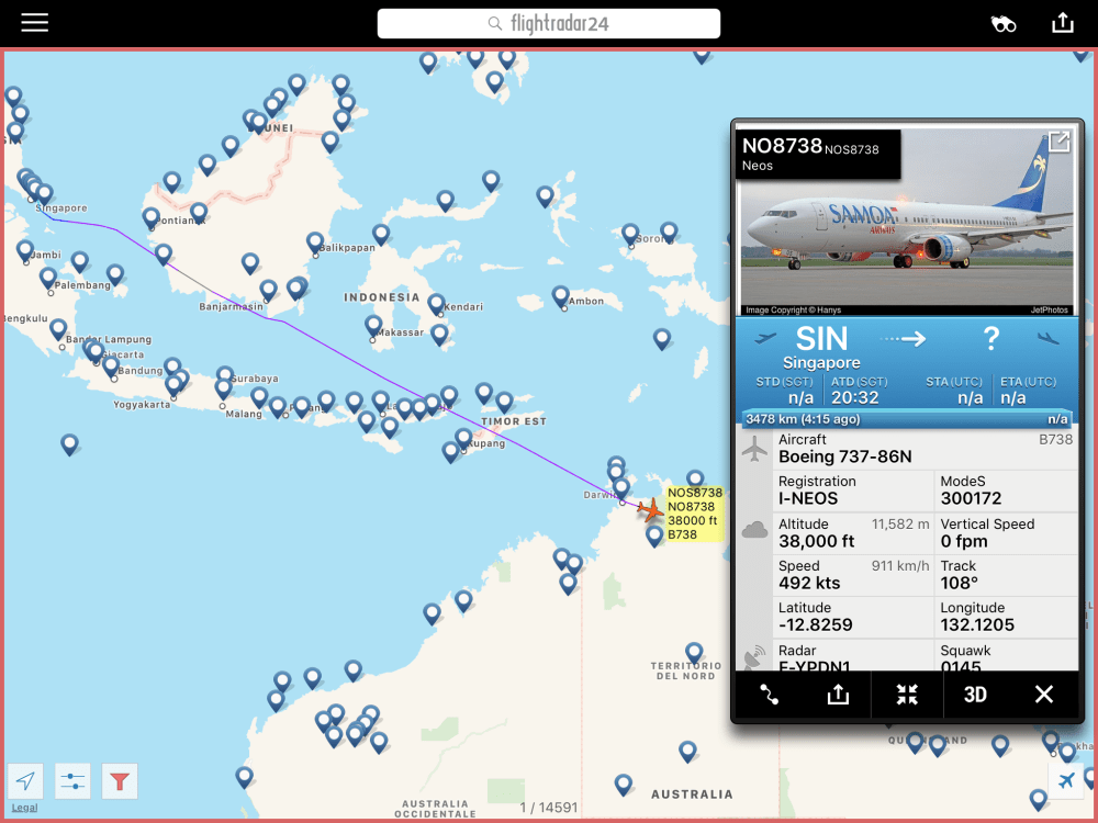 Terza tappa per il B737/86N I-NEOS verso #WesternSamoa. Decollato poco più di quattro ore fa da #Singapore, punto di arrivo del secondo volo originato da #Muscat.