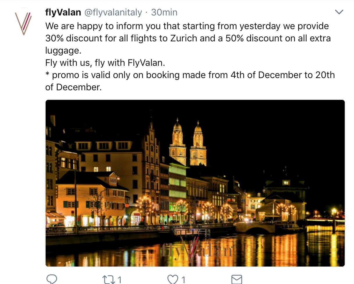 compagnie aeree, rotte, vola e paga poco Fly Valan in promozione su Zurigo Pubblicato da Italiavola il 15 novembre 201715 novembre 2017 Extra bagagli con un 50% di sconto e 30% sui voli da #Genova a #Zurigo di #Flyvalan dal 4/12 al 20/12. Condividi: Fai clic per condividere su Facebook (Si apre in una nuova finestra) Facebook Fai clic qui per condividere su LinkedIn (Si apre in una nuova finestra) LinkedIn Fai clic qui per condividere su Reddit (Si apre in una nuova finestra) Reddit Fai clic qui per condividere su Pinterest (Si apre in una nuova finestra) Pinterest Fai clic qui per condividere su Tumblr (Si apre in una nuova finestra) Tumblr Fai clic per condividere su X (Si apre in una nuova finestra) X Mi piace Caricamento... Correlati