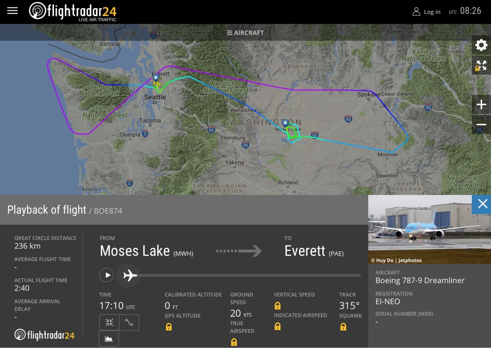 Dallo screenshot si vede che domenica scorsa il B787-9 EI-NEO della Neos ha volato da Moses Lake a Everett. In precedenza ha effettuato almeno un volo da Everett a Moses Lake.