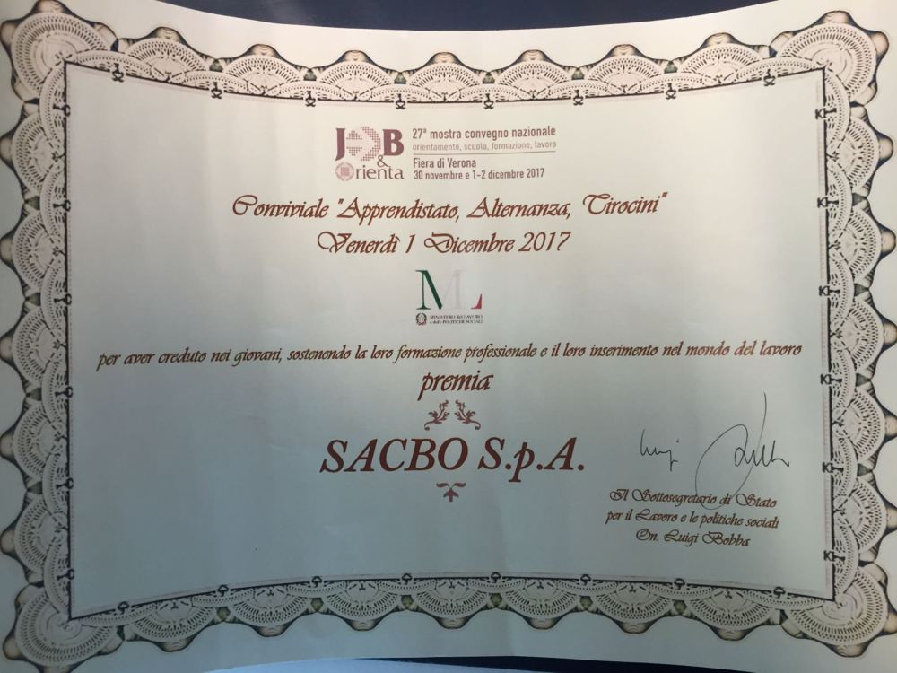 SACBO ha ricevuto un ulteriore, prestigioso riconoscimento nel campo della formazione, in occasione della 27a edizione di Job&Orienta, mostra convegno nazionale su orientamento, scuola, formazione e lavoro, svoltasi alla Fiera di Verona.
