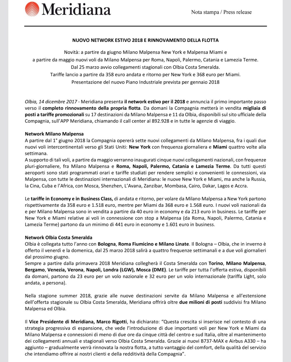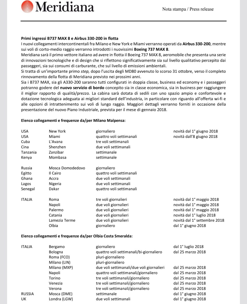 Puntuali le anticipazioni sulla flotta a suo tempo indicate da noi si sono rivelate veritiere. #Meridiana apre da #Milano #Malpensa i voli a lungo raggio giornalieri per New York e quadrisettimanali per #Miami. Nuove rotte nazionali di alimentazione su #Napoli, #Palermo, #Catania, #Lamezia Terme. Saltano quindi i voli diretti per la grande mela su Napoli e Palermo.