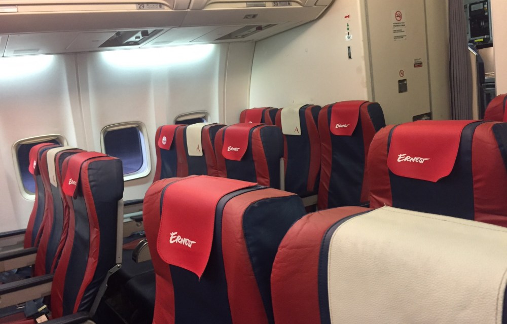 Ci stanno bene i loghi #Ernest sull’aereo AlbaStar recentemente nitrato in flotta. Ecco gli appoggia testa con i loghi della compagnia aerea italiana apposti sui sedili del vettore spagnolo.