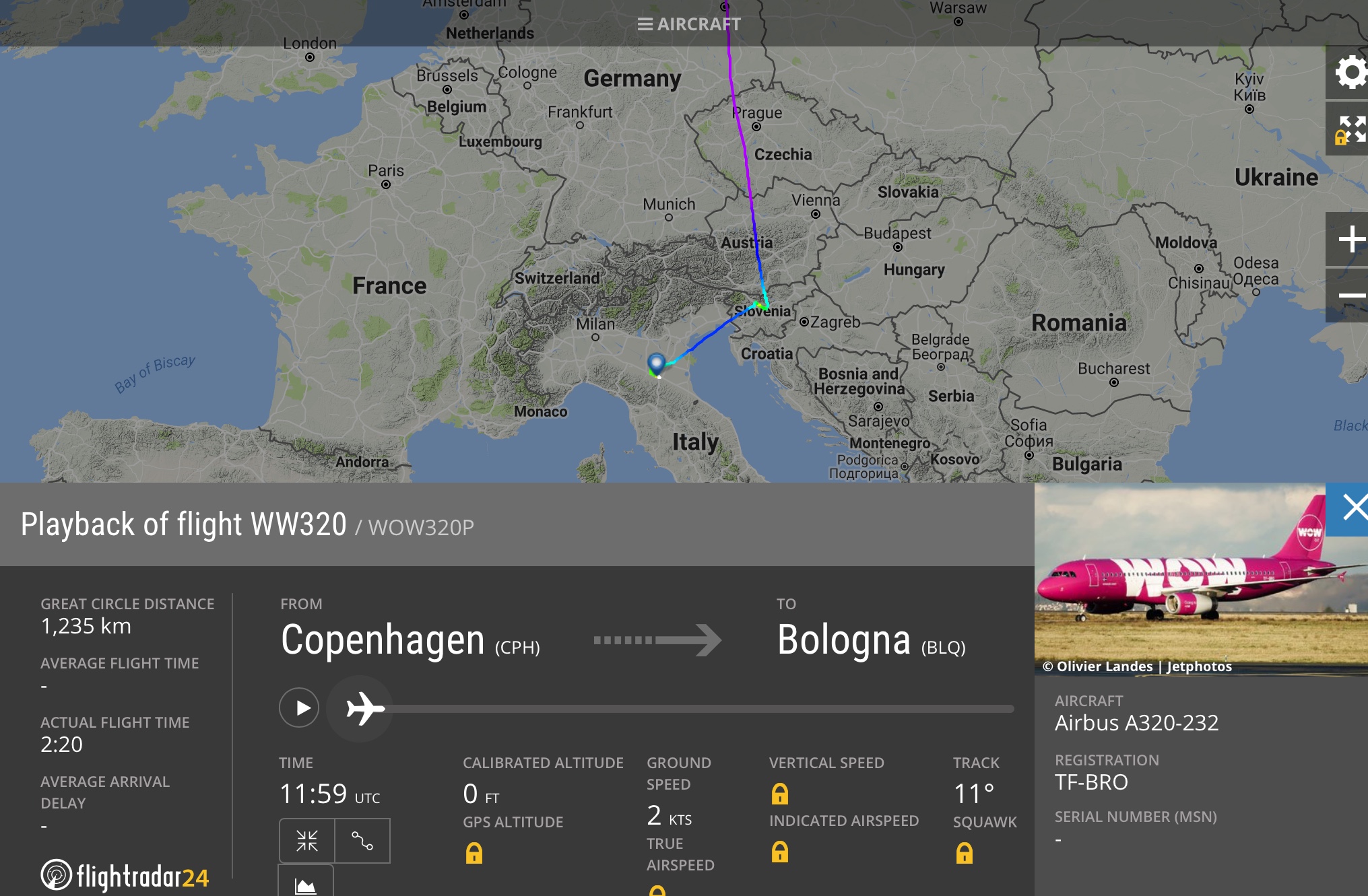 Operava il volo WOW320P da #Copenaghen a #Lubiana, ma la visibilità sulla capitale slovena era sotto le minime operative dell’aeroporto e di conseguenza per il volo. L’aereo ha effettuato un avvicinamento, alle minime ha riattaccato ed ha proseguito per l’alternato. Il primo aeroporto inserito nel piano di volo era Bologna, dove l’aereo e’ atterrato senza problemi di sorta.