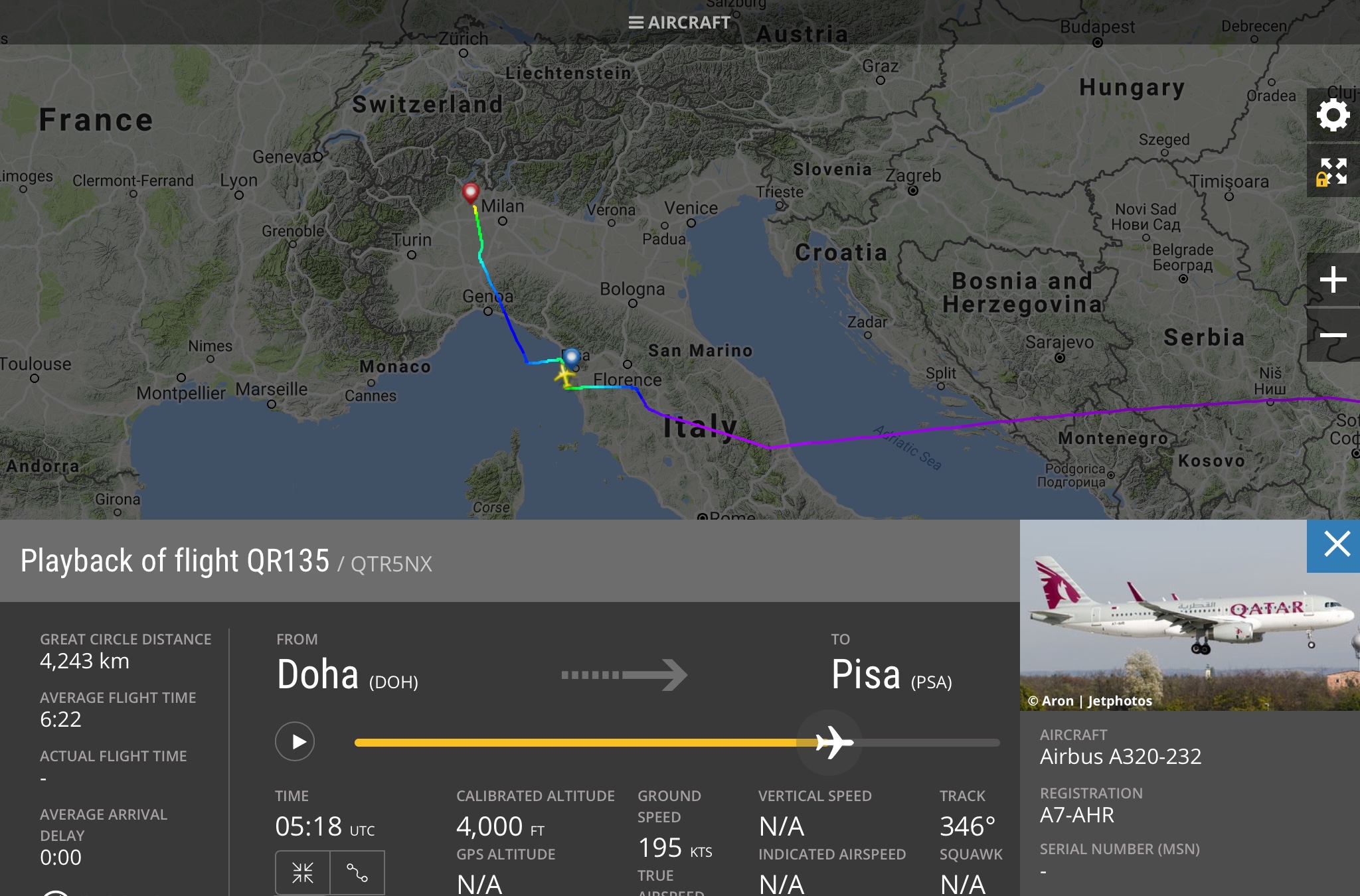 Il volo di questa mattina da #Doha a #Pisa della Qatar Airways con A320 A7-AHR e’ stato forzato a proseguire per #Milano #Malpensa a causa del forte vento che spirava da 240 gradi. Ciò avrebbe comportato un avvicinamento da 22L, ma non possibile a causa dell’oscurità. L’aereo poi in mattinata e’ ritornato a Pisa in volo ferry.