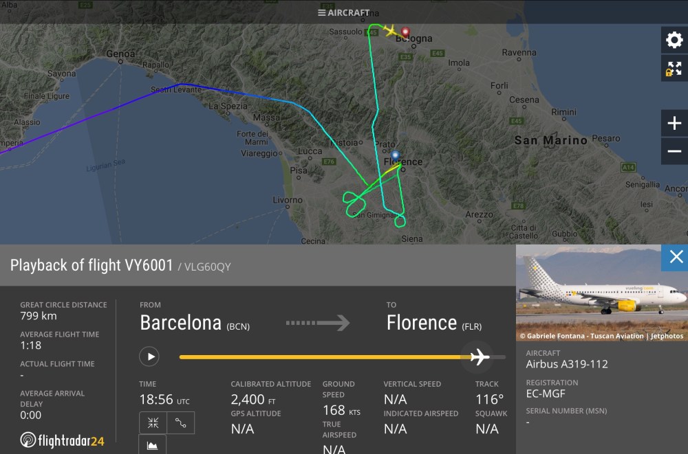 Questa sera il volo VY6001 da #Barcellona di #Vueling per #Firenze ci ha provato due volte, ma entrambi gli avvicinamenti si sono conclusi con una riattaccata. Quindi la decisione di dirottare a #Bologna. Le condizioni meteorologiche a Firenze riportano vento in coda a raffiche Fino a 22 nodi, nubi basse con pioggia debole. L’aereo e’ un A319-112 EC-MGF.