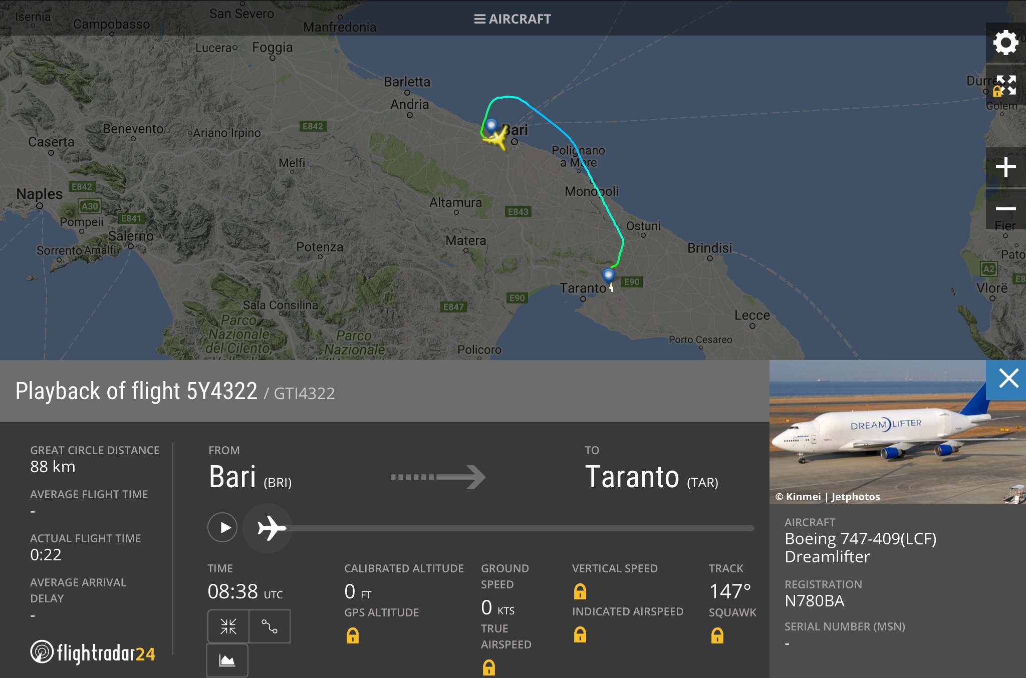 Questa mattina e’ ripartito da #Bari per #Taranto il Boeing 747-409LCF Dreamlifter N780BA della #Boeing. L’aereo era atterrato ieri a Bari in divisione da Taranto a causa della scarsa visibilità verticale. I voli su Taranto sono operati per trasportare le parti necessarie all’assemblaggio e costruzione dei Boeing 787 Dreamliner.