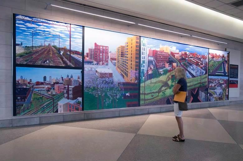 Now on display in Terminal D, Her Philadelphia by artist Sarah McEneaney is a visual diary of her life that references Rail Park – a location that for more than 10 years McEneaney has worked tirelessly totransform and revitalize the unused elevated rail line into a vibrant community park. Today, her dream is being realized as this project is currently under construction.