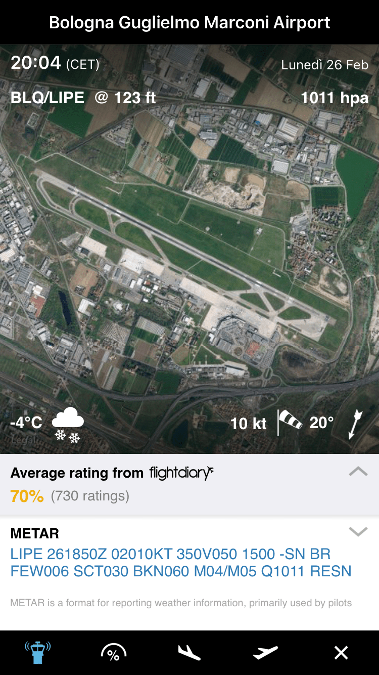 Neve debole al momento a Bologna e Ancona. Trafffico regolare sullo scalo emiliano con qualche ritardo per effettuare il defrost degli aerei. Temperature sotto lo zero a -4 con -5 il dewpoint.