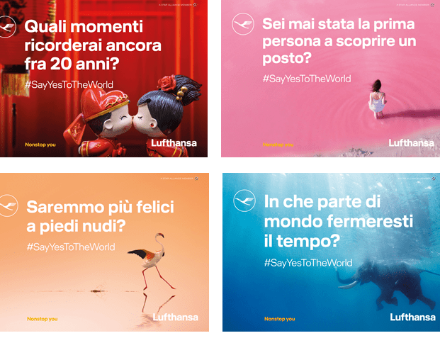 Con “Say Yes to the world” Lufthansa inizia un nuovo capitolo: aiutando le persone ad aprirsi al mondo, vicina a tutti coloro che vedono il viaggio come fonte di ispirazione e che considerano l’esplorazione fondamentale nel definire l’essere umano, determinandone interessi, obiettivi e desideri. “Say yes to the world” non è solo un atteggiamento: è anche un appello. Un invito a mettere in discussione le proprie abitudini e i propri schemi mentali. E’ per questo che nella campagna non compaiono affermazioni, ma domande aperte, alle quali ognuno può dare la propria personale risposta, frutto della propria unica esperienza.