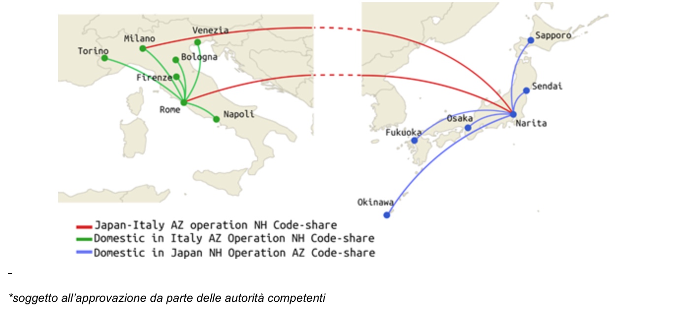 Alitalia effettua voli diretti da Roma Fiumicino e da Milano Malpensa per Tokyo Narita, sui quali ANA applicherà il proprio codice di volo ‘NH’. La Compagnia italiana applicherà il proprio codice ‘AZ’ ai voli operati da ANA fra Tokyo Narita e Osaka, Fukuoka, Okinawa, Sendai e Sapporo, in coincidenza con i voli Alitalia provenienti da Roma e Milano.
