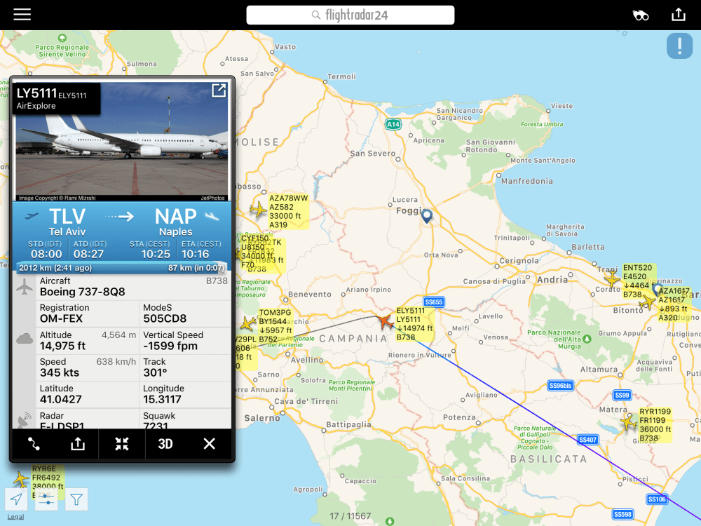 Il volo tra Tel Aviv e Napoli di El Al e’ meramente un volo charter camuffato come volo di linea. Lo si nota dal numero di volo a quattro cifre, di solito per i voli di linea puri la compagnia israeliana usa il codice a tre cifre. Infatti, oggi utilizza un vettore terzo con un B737/800 con una configurazione ad alta densità e non la tipica legacy dei suoi velivoli. Oggi e’ Air Explore, linea aerea slovacca.