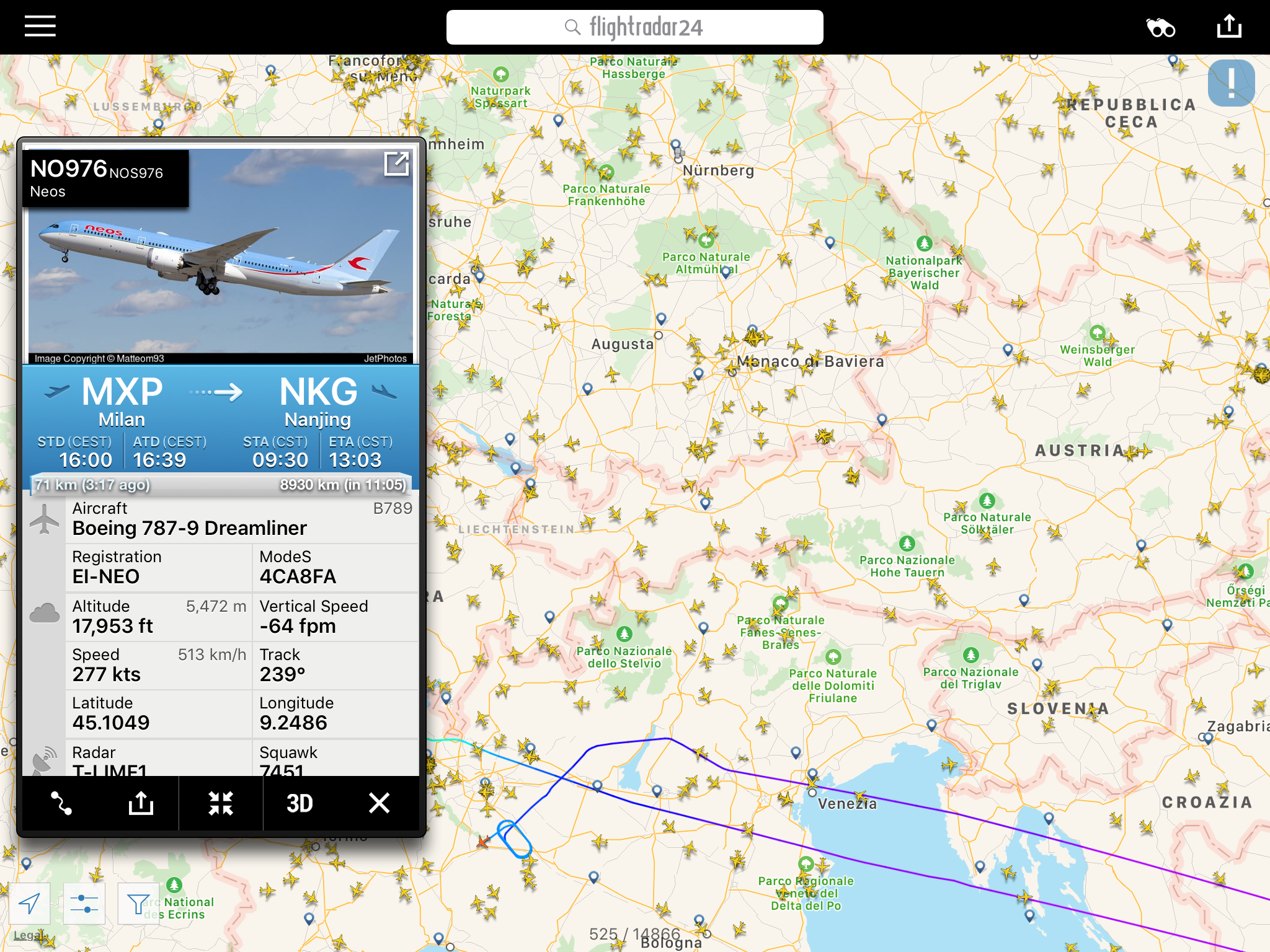 Questo pomeriggio il B787-9 #Neos EI-NEO decollato da #Milano #Malpensa per #Nanchino sulla #Bulgaria ha invertito la rotta ed e’ ritornato all’aeroporto di partenza. Sulla via del ritorno a causa del maltempo temporaneo su Malpensa ha dovuto effettuare alcune holding su #Codogno eppoi a est di Casale Monferrato.