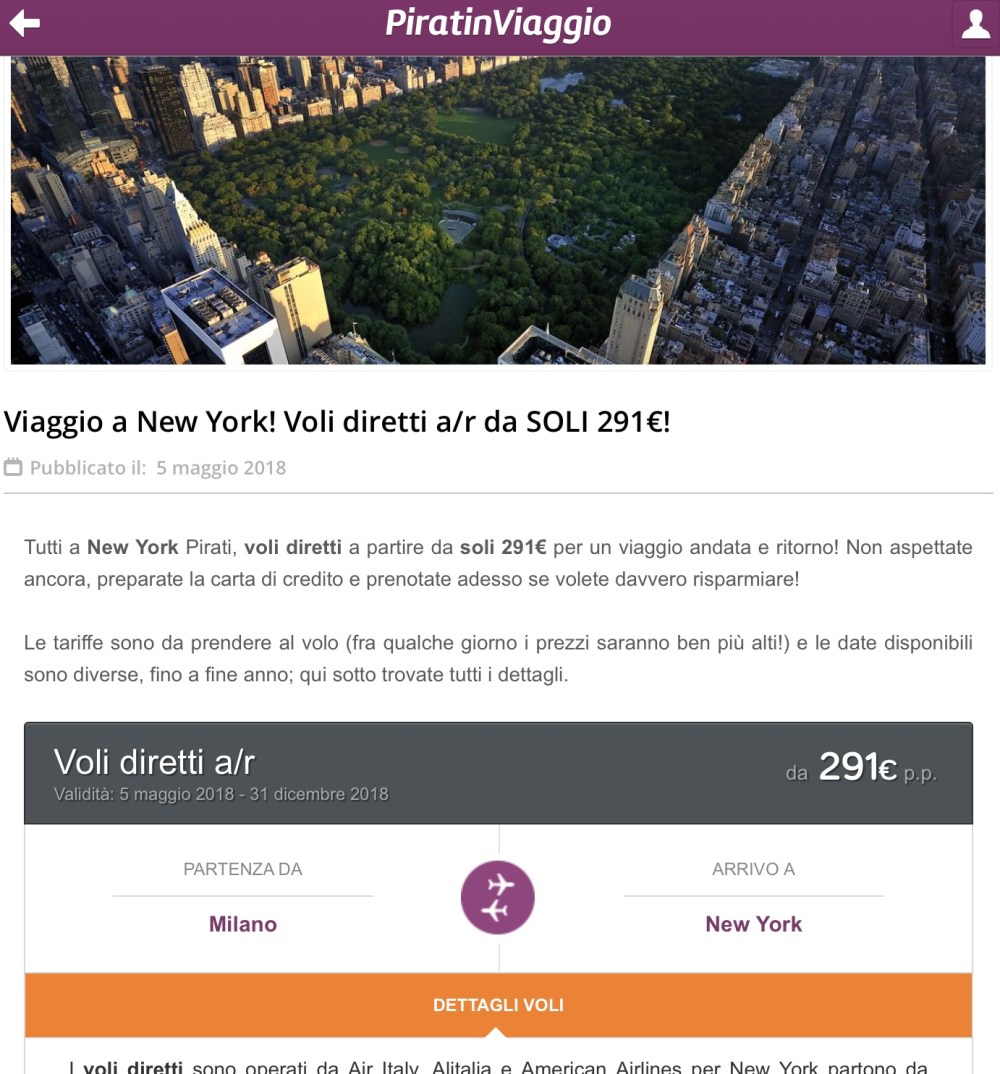 compagnie aeree, rotte New York? Provateci con Air Italy anche da 291€ andata e ritorno Pubblicato da Italiavola il 6 Maggio 2018 E’ di ieri da PiratinViaggio ci sono svariate combinazioni da Air Italy per volare da Milano a New York a partire da 291€ andata e ritorno, prezzi con il solo bagaglio a mano. Provateci! Più bassi di così?! Condividi: Fai clic per condividere su Facebook (Si apre in una nuova finestra) Facebook Fai clic qui per condividere su LinkedIn (Si apre in una nuova finestra) LinkedIn Fai clic qui per condividere su Reddit (Si apre in una nuova finestra) Reddit Fai clic qui per condividere su Pinterest (Si apre in una nuova finestra) Pinterest Fai clic qui per condividere su Tumblr (Si apre in una nuova finestra) Tumblr Fai clic per condividere su X (Si apre in una nuova finestra) X Mi piace Caricamento... Correlati