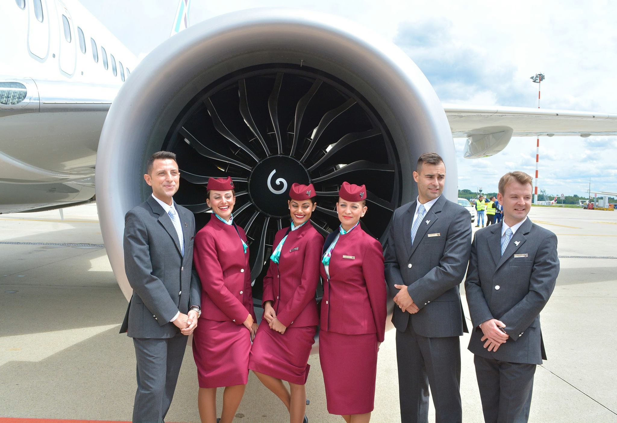 Nuove divise per il personale navigante di Air Italy, quì nell’immagine posta sopra gli assitenti di volo assieme ad Akbar al Baker, GCEO di Qatar Airways.