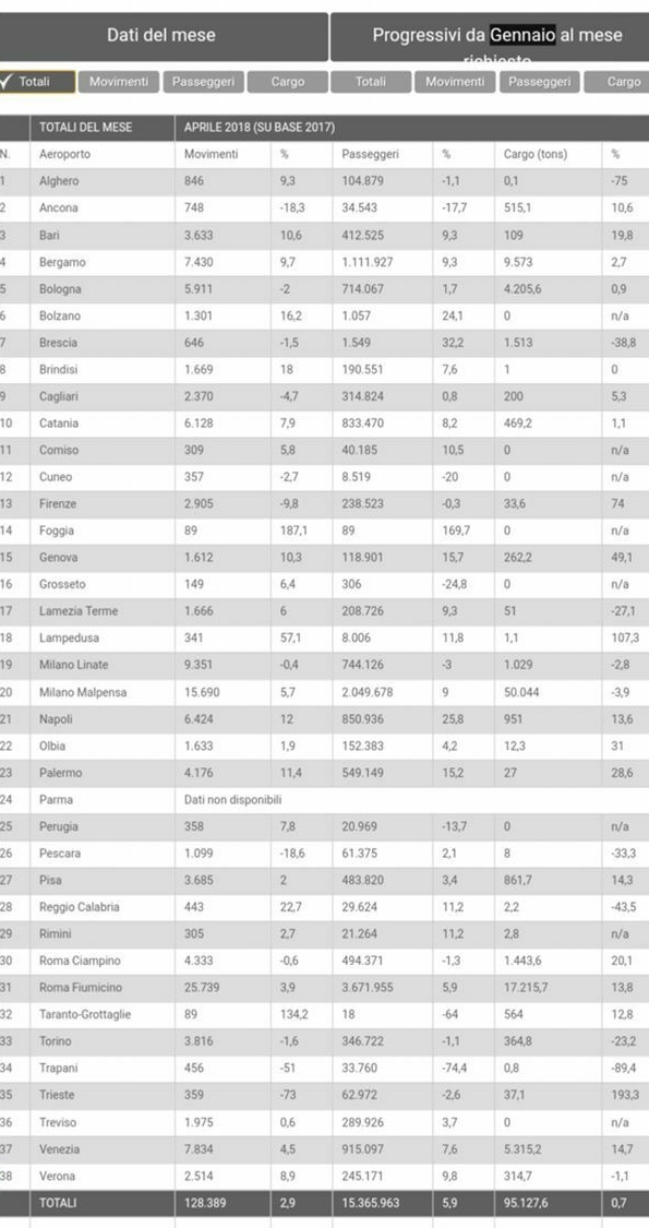 aeroporti, compagnie aeree, in quanti volano? Aeroporti italiani: I dati di aprile 2018 Pubblicato da Italiavola il 1 giugno 2018 Assaeroporti ha pubblicato i dati afferenti al mese di aprile 2018. Non sono presenti quelli di Parma. Condividi: Fai clic per condividere su Facebook (Si apre in una nuova finestra) Facebook Fai clic qui per condividere su LinkedIn (Si apre in una nuova finestra) LinkedIn Fai clic qui per condividere su Reddit (Si apre in una nuova finestra) Reddit Fai clic qui per condividere su Pinterest (Si apre in una nuova finestra) Pinterest Fai clic qui per condividere su Tumblr (Si apre in una nuova finestra) Tumblr Fai clic per condividere su X (Si apre in una nuova finestra) X Mi piace Caricamento... Correlati