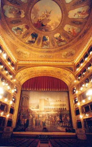 Realizzato tra il 1894 e il 1896 da Giuseppe Sciuti, il sipario del Teatro Massimo fu utilizzato in occasione di ogni rappresentazione a partire dall’inaugurazione del 1897 fino al 1974, quando il Teatro fu chiuso. Il sipario, che misura 14 metri di larghezza per 12 di altezza, rappresenta il Corteo di re Ruggero che esce dal Palazzo reale per recarsi in Cattedrale nel giorno dell’incoronazione e fu realizzato da Giuseppe Sciuti come parte integrante della sala.
