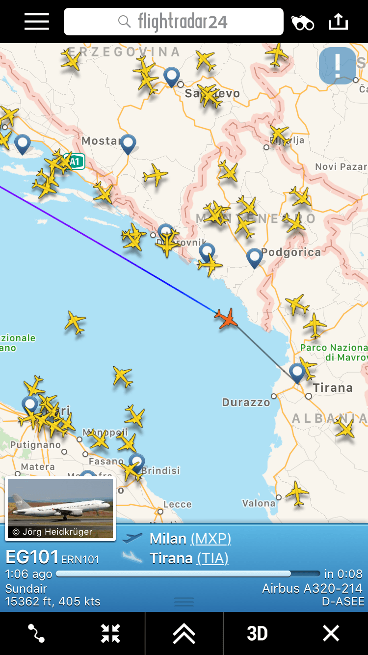 Oggi la Ernest Airlines ha la Sundair sui propri voli come si vede per la EG101 da Milano Malpensa a Tirana. L’aereo e’ un A320-214 D-ASEE.