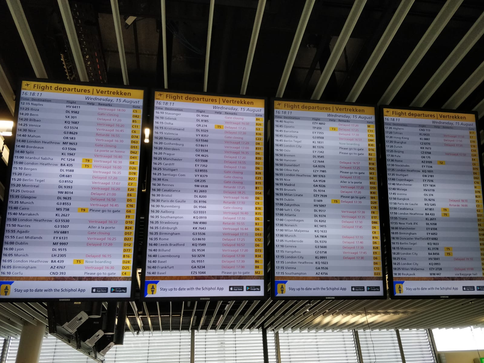 Il caos di ieri all’aeroporto di Amsterdam. Saltato il sistema di comunicazione tra il radar e la sala del controllo del traffico aereo ha mandato in tilt tutto il traffico. Cosi si mostrava il pannello informazioni sulle partenze a meta’ pomeriggio. Grazie ad AA per l’immagine.