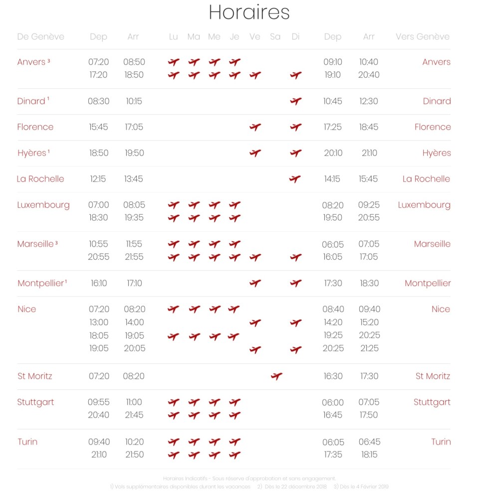 Fino a qualche settimana fa il focus era sopratutto l’Italia con voli verso Bologna, Firenze, Torino e Venezia da Ginevra. Ora rimane solo Firenze con voli bisettimanali contro il giornaliero passato. Torino rimane con le due frequenze al giorno mattina e sera dal lunedì al giovedì. Le destinazioni diventano maggiormente verso Belgio, Francia e Germania. La partenza dei voli rimane invece sempre da ottobre 2018. Un dettaglio i voli non sono ancora in vendita.