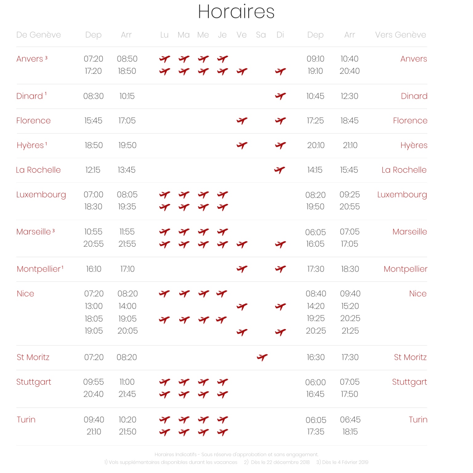 Fino a qualche settimana fa il focus era sopratutto l’Italia con voli verso Bologna, Firenze, Torino e Venezia da Ginevra. Ora rimane solo Firenze con voli bisettimanali contro il giornaliero passato. Torino rimane con le due frequenze al giorno mattina e sera dal lunedì al giovedì. Le destinazioni diventano maggiormente verso Belgio, Francia e Germania. La partenza dei voli rimane invece sempre da ottobre 2018. Un dettaglio i voli non sono ancora in vendita.