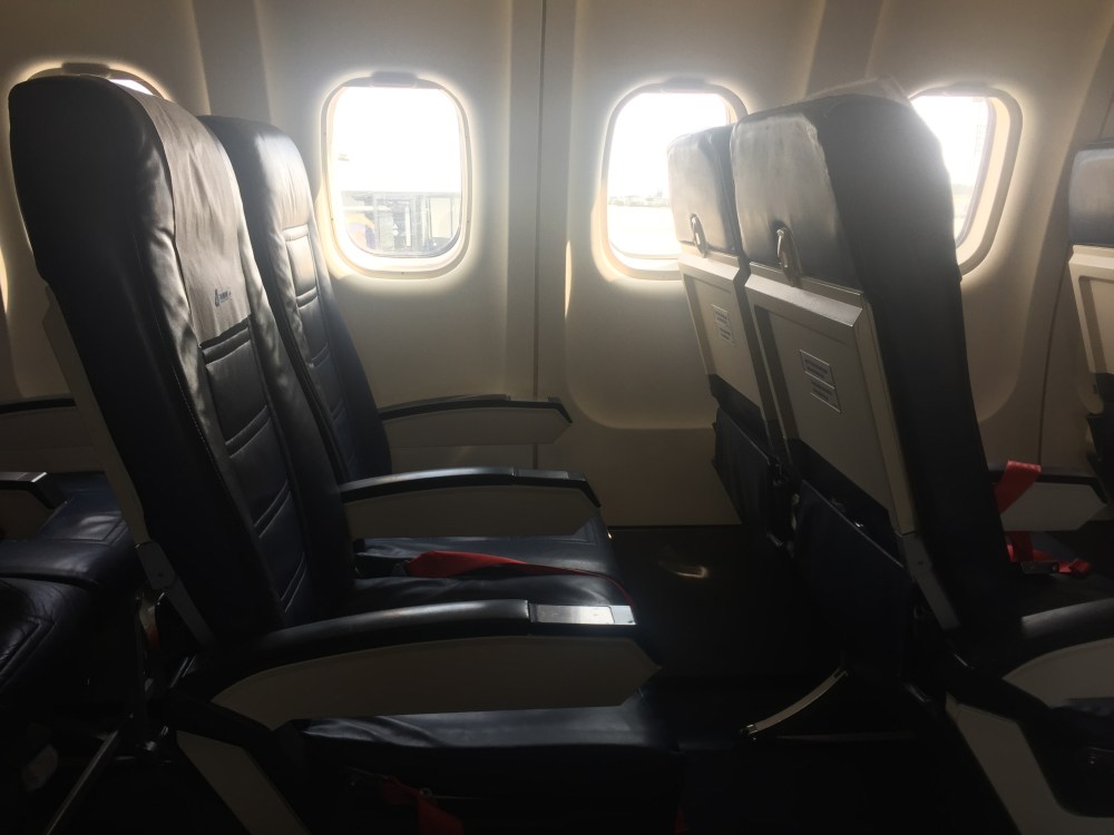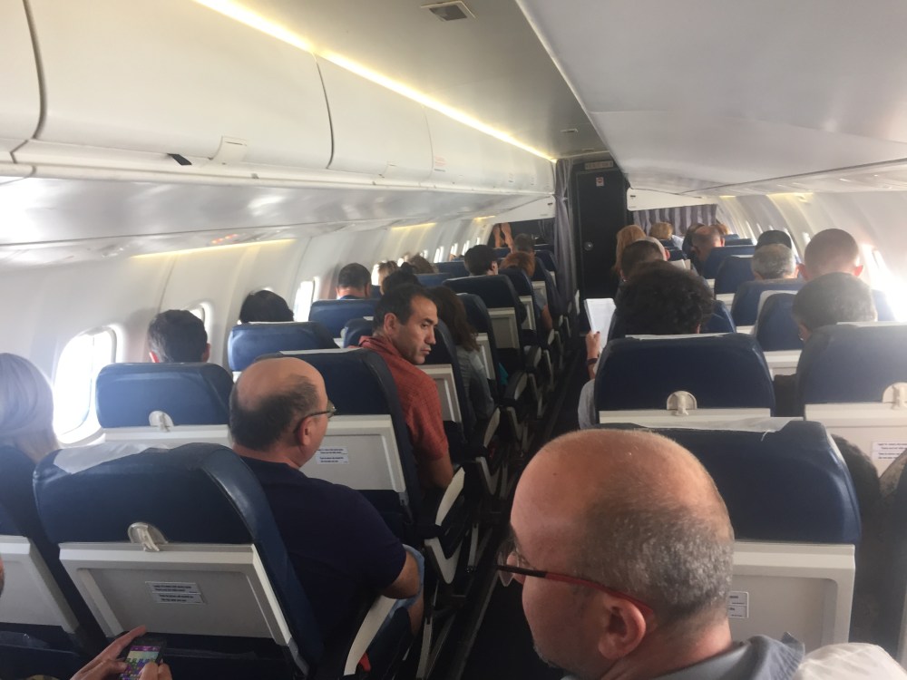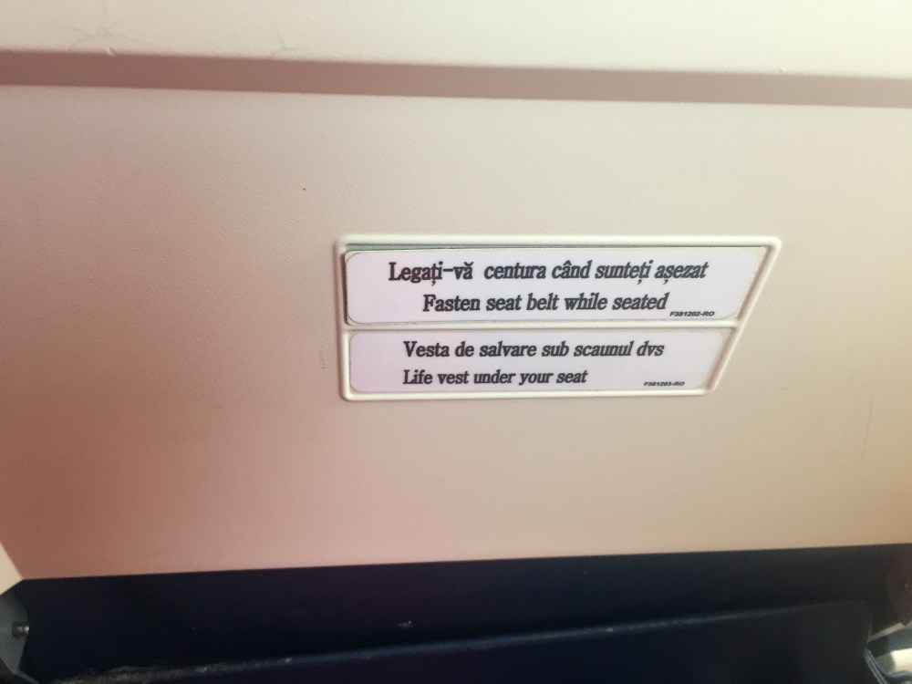Ecco gli interni di un ATR42/500 TAROM, nel passato erano abbastanza presenti su molte rotte sottili italiane. Ha una cinquantina di posti con sedili in pelle blu e come si vede nella foto dell’interno cabina, la parte anteriore con il divisorio riposizionabile ha un compartimento di business Class.