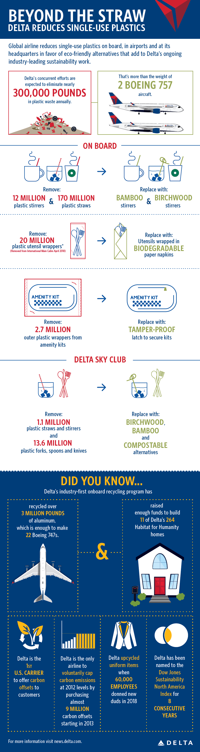 Nelle lounge Delta Sky Club le cannucce rosse e i bastoncini di plastica per mescolare zucchero e bevande sono stati sostituiti da cannucce in bambù ecocompatibili e bastoncini in betulla, mentre a bordo cannucce e bastoncini di plastica verranno sostituiti a favore delle stesse alternative a partire dalla metà del 2019. Queste operazioni, insieme, porteranno ad eliminare un totale di oltre 183 milioni di cannucce e bastoncini di plastica nelle lounge e sugli aeromobili Delta.