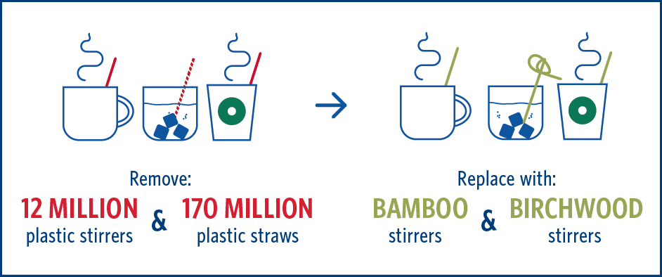 * I bastoncini di plastica per mescolare zucchero e bevande sono attualmente sostituiti con bastoncini in bamboo per le bevande fredde, e bastoncini in legno di betulla per le bevande calde;