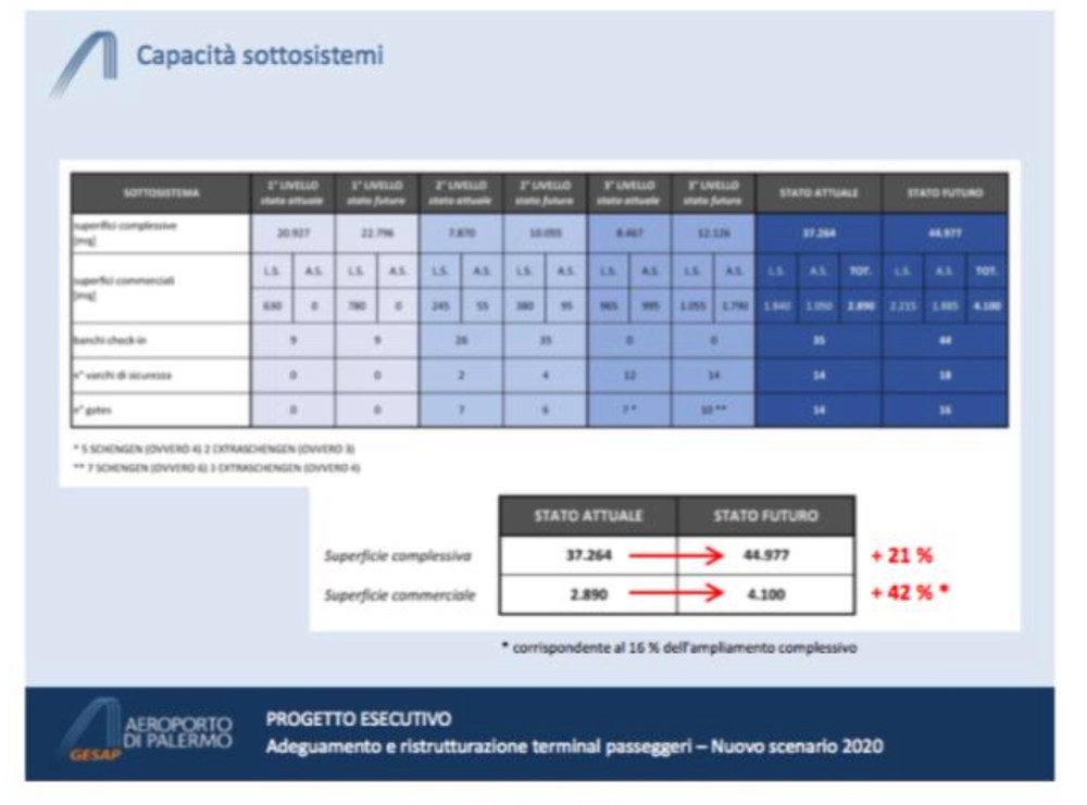 La Gesap, la società di gestione dell’aeroporto di Palermo Falcone Borsellino ha previsto l’avvio dei cantieri a metà aprile. Mille giorni di lavori per il primo lotto funzionale (oltre 48 milioni di euro di fondi Gesap). Due le gare pubblicate da Gesap: la procedura aperta per assegnare il servizio di direzione dei lavori (scade il 17/12/2018) e il bando ad evidenza pubblica per l’affidamento dei lavori relativi al primo lotto funzionale (scade il 27/12/2018).