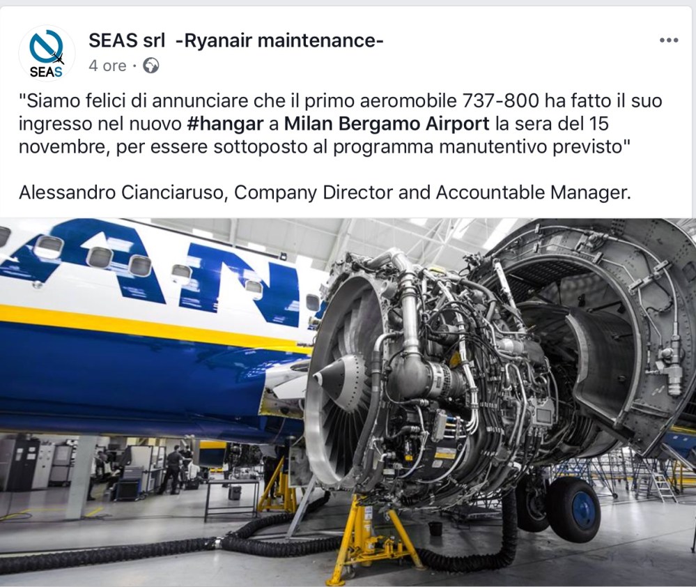 compagnie aeree SEAS: primo aereo Ryanair nel secondo hangar di Bergamo Pubblicato da Italiavola il 19 novembre 2018 SEAS su Facebook comunica che il secondo hangar Ryanair e’ già attivo da giovedì.scorso Condividi: Fai clic per condividere su Facebook (Si apre in una nuova finestra) Facebook Fai clic qui per condividere su LinkedIn (Si apre in una nuova finestra) LinkedIn Fai clic qui per condividere su Reddit (Si apre in una nuova finestra) Reddit Fai clic qui per condividere su Pinterest (Si apre in una nuova finestra) Pinterest Fai clic qui per condividere su Tumblr (Si apre in una nuova finestra) Tumblr Fai clic per condividere su X (Si apre in una nuova finestra) X Mi piace Caricamento... Correlati