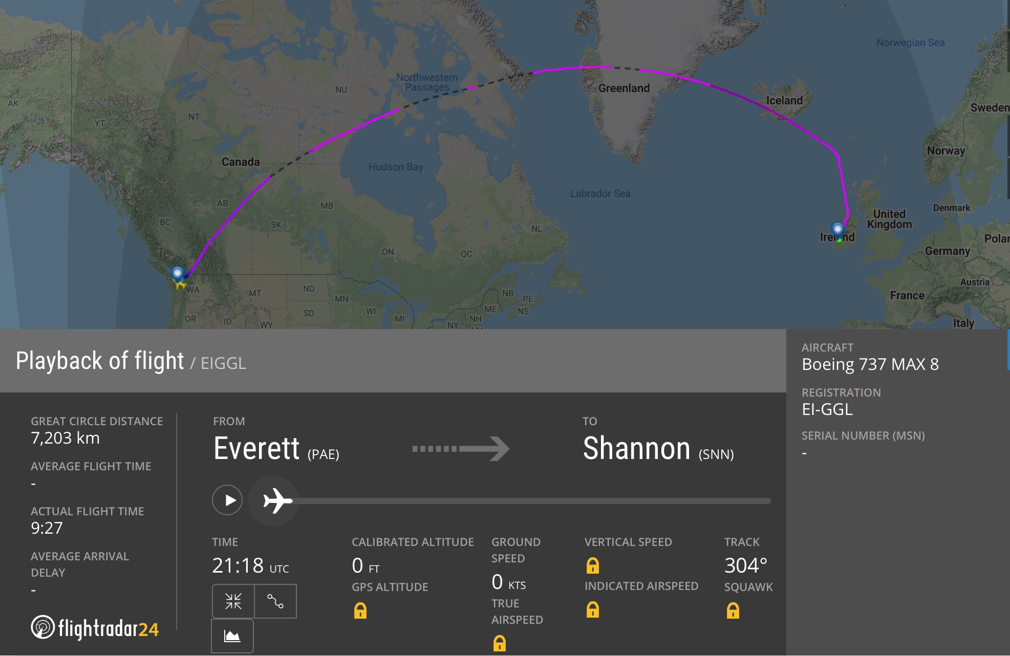 Con un volo di nove ore e ventisette minuti il B737MAX8 EI-GGL per Air Italy ha compiuto il balzo tra Everett e Shannon volando con la matricola e non con il call sign di compagnia come accadde per i due precedenti bigetti di nuova consegna. L’arrivo a Shannon e’ stato alle 7:10 ora locale.
