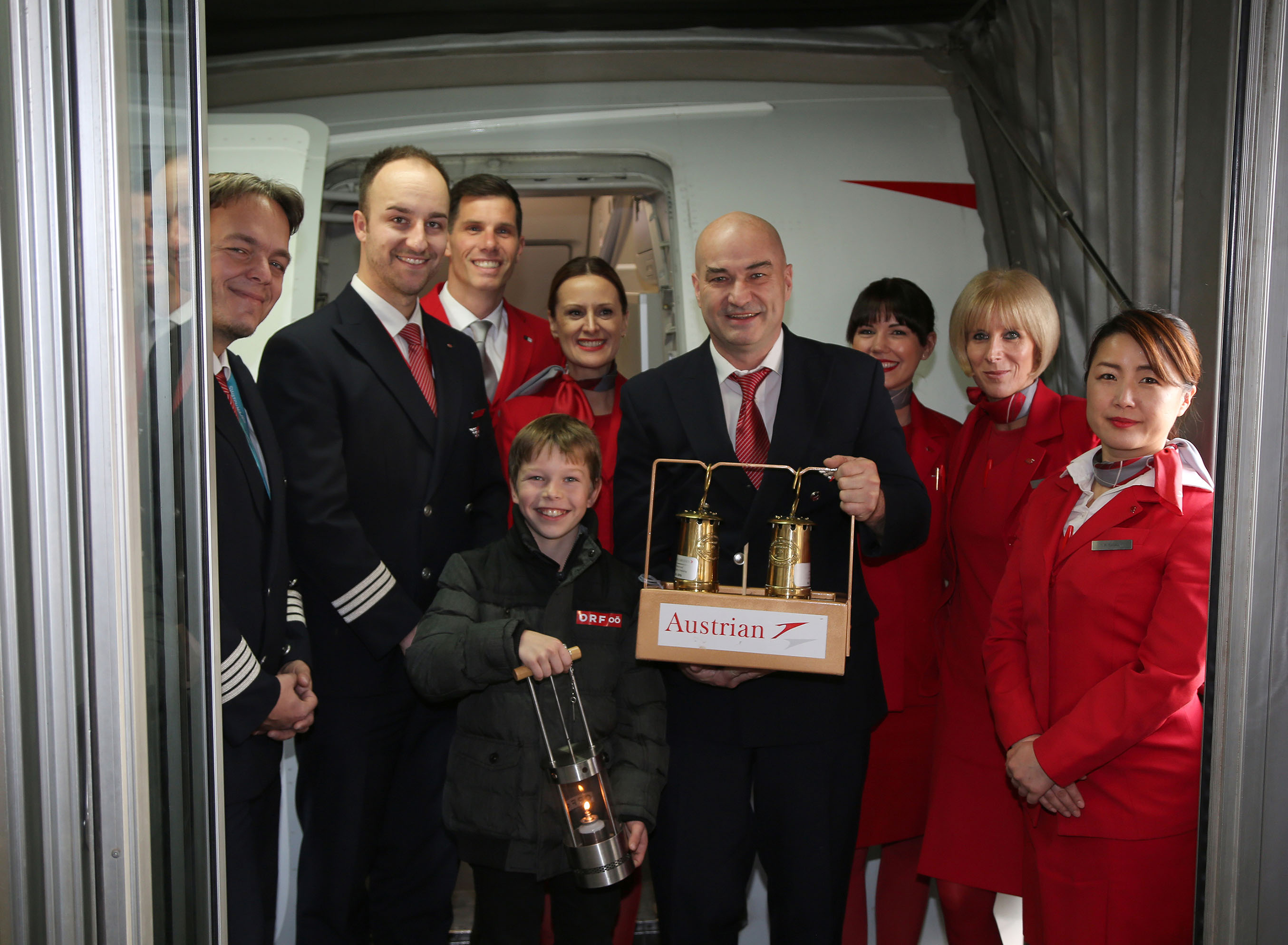 Austrian Airlines brought the ORF (Austrian Broadcasting Corporation) Light of Peace from Tel Aviv to Austria for the 32nd time. Flight OS 858 with the special freight on board landed safely at Vienna Airport Wednesday night. The transport was accompanied by this year’s designated light of peace child Niklas Lehner, Light of Peace Project Manager Günther Hartl from the ORF regional studio in Upper Austria and Wolfgang Kerndler, Flight Safety & Security advisor at Austrian Airlines.