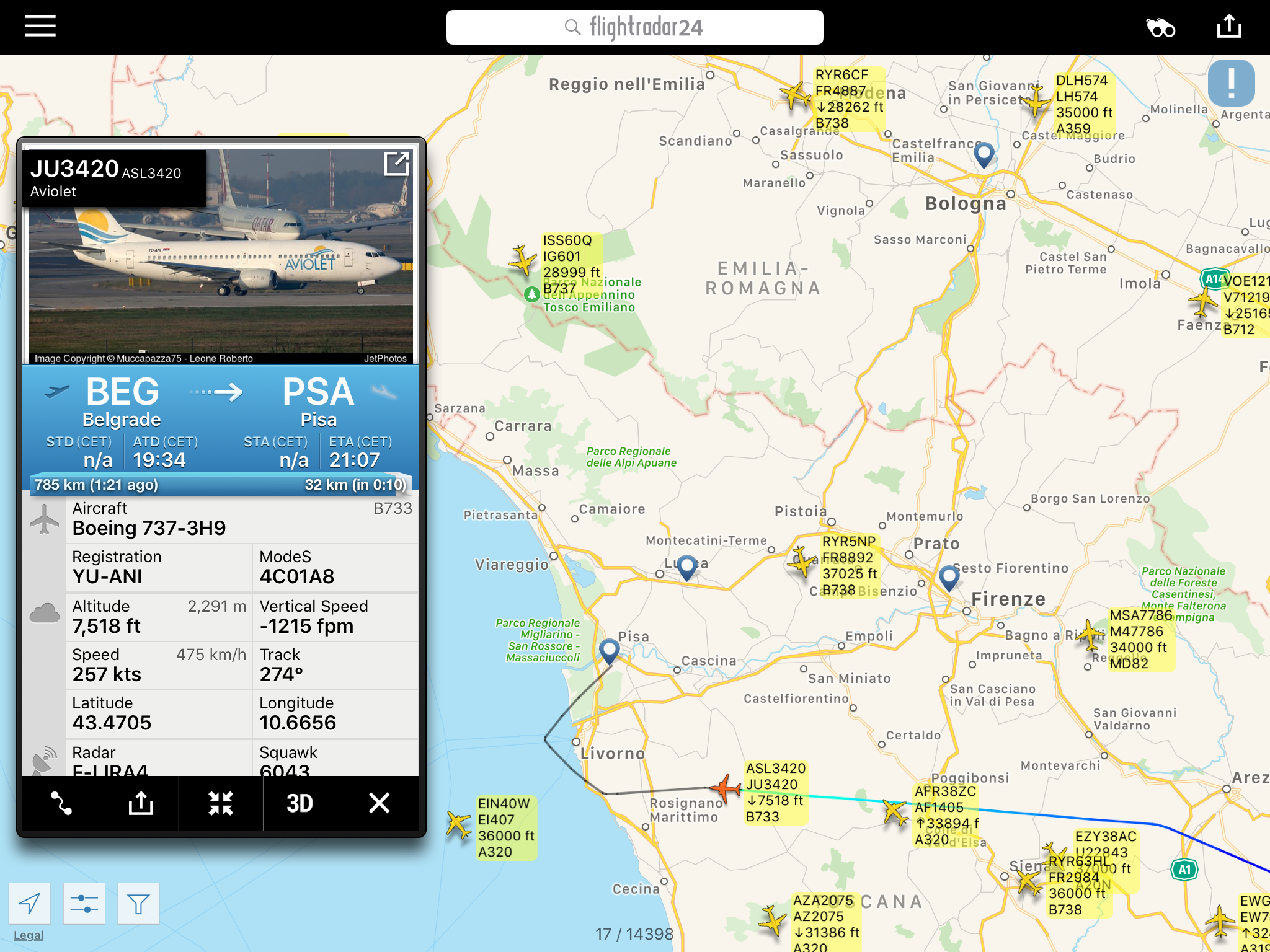 Aviolet sta per atterrare a Pisa proveniente da Belgrado come JU3420.
