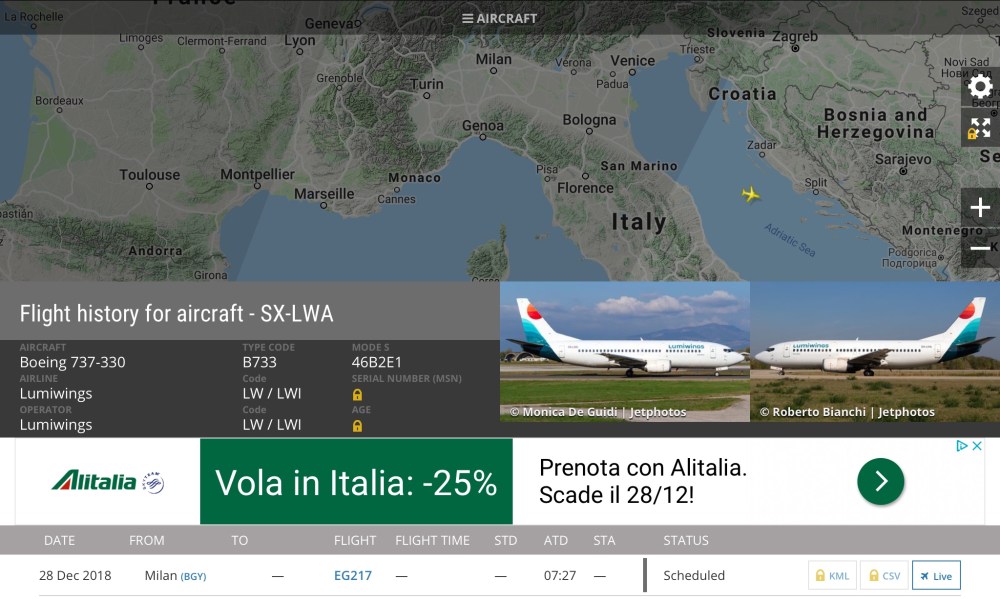 Il dirottamento di ieri sera a Bergamo del Kiev – Bologna del B737-330 SX-LWA della Lumiwings ha visto posticipare a questa mattina il successivo previsto Bologna – Tirana operato in partenza da Bergamo.