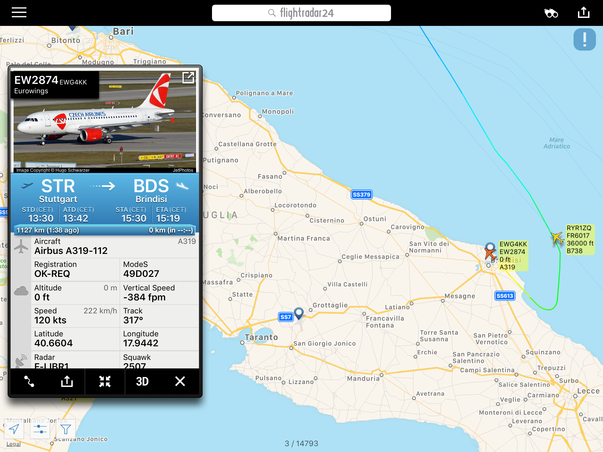 Il velivolo sta operando sulla rotta tra Stoccarda e Brindisi sul volo EW2874.