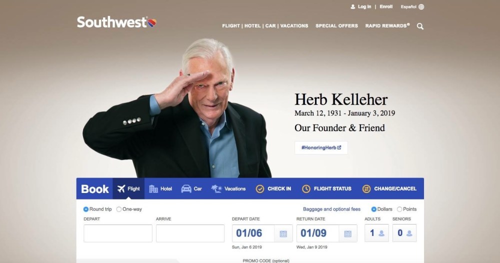 La pagina principale di Southwest oggi ricorda la scomparsa di Herb Kelleher, uno dei suoi fondatori.