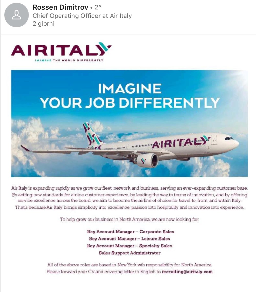 Air Italy sta cercando alcuni sales per il Nord America. In particolare per i tre settori del mercato e cioè