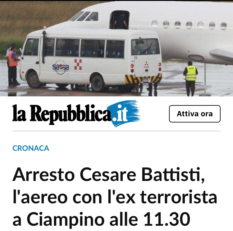 compagnie aeree, rotte Battisti arriverà in anticipo a Roma. Atterrera’ alle 11:30 a Ciampino Pubblicato da Italiavola il 14 gennaio 201914 gennaio 2019 Fra poco, come titola La Repubblica arriverà Cesare Battisti a Roma Ciampino. L’aereo nella foto appartenente a CAI e’ stato ripreso alla partenza in Bolivia. L’aereo proviene dal paese sudamericano via Ilha di Sal. Condividi: Fai clic per condividere su Facebook (Si apre in una nuova finestra) Facebook Fai clic qui per condividere su LinkedIn (Si apre in una nuova finestra) LinkedIn Fai clic qui per condividere su Reddit (Si apre in una nuova finestra) Reddit Fai clic qui per condividere su Pinterest (Si apre in una nuova finestra) Pinterest Fai clic qui per condividere su Tumblr (Si apre in una nuova finestra) Tumblr Fai clic per condividere su X (Si apre in una nuova finestra) X Mi piace Caricamento... Correlati