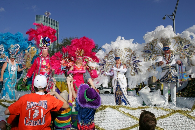 Dobloni, perline, tazze ed altro ancora sono i tradizionali ninnoli lanciati dai carri alla folla festante: tradizione nata nel 1870 grazie ai Twelfth Night Revelers, ed ancora oggi attesa da tutti. La prima parata del Mardi Gras si tenne a New Orleans il 24 Febbraio, 1857 con la Krewe of Comus presentando una parata con carri mascherati, seguita da un ballo della Krewe e dei propri ospiti. Le Krewe locali offrono quello che si definisce “Il Più Grande Spettacolo Gratuito esistente sulla Terra”. Ma molte Krewe non sfilano nel French Quarter bensì in altri quartieri cittadini, ove la genuinità della tradizione si conserva con marce di bande, musica dovunque, ninnoli lanciati in aria, dobloni e collanine. Contrariamente alla percezione comune, il Mardi Gras è una celebrazione per la famiglia. I luoghi migliori per assistere alle parate è dove iniziano sulla St. Charles Avenue accanto a Napoleone. La porzione della St.Charles – Garden District – è adatta alle famiglie, ove ci si diverte anche con picnic, giocando a palla o riposandosi sotto le grandi querce. I tram in questa zona si fermano durante il Mardi Gras.