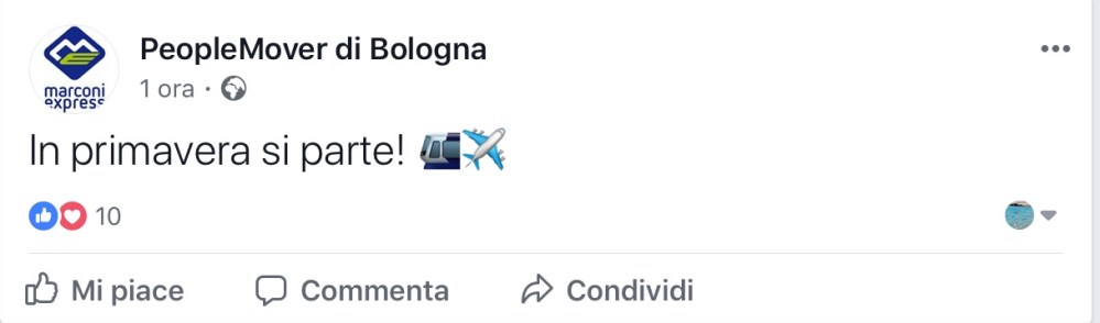 Un oretta fa sulla pagina Facebook del People Mover di Bologna della Marconi Express SpA e’ apparso questo breve post. E’ l’annuncio che in primavera si partirà con le prime corse tra aeroporto di Bologna e la stazione centrale della città emiliana.