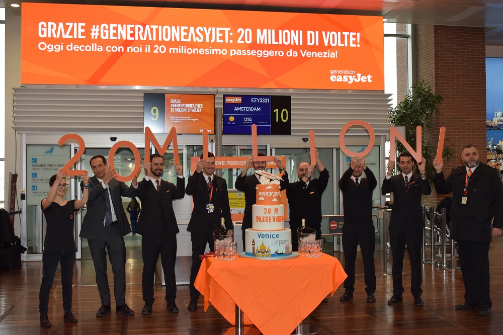 Venezia, 28 gennaio 2019 – easyJet, compagnia aerea leader in Europa, e l’aeroporto di Venezia Marco Polo, festeggiano oggi il raggiungimento di un importante traguardo: 20 milioni di passeggeri trasportati da e per lo scalo veneziano a partire dal 1998, anno in cui la compagnia ha operato il primo volo verso l’Italia.