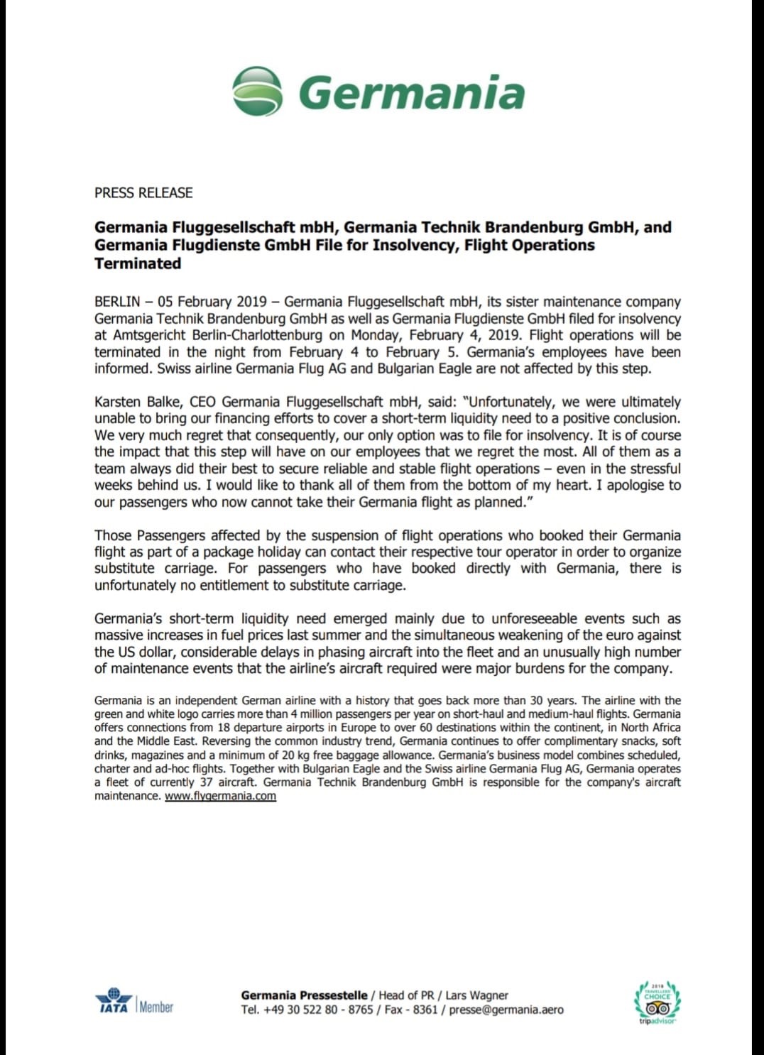 Con la nota che riportiamo di seguito, ieri e’ stato l’ultimo giorno per Germania Airlines. Da oggi tutte le attività sono sospese.