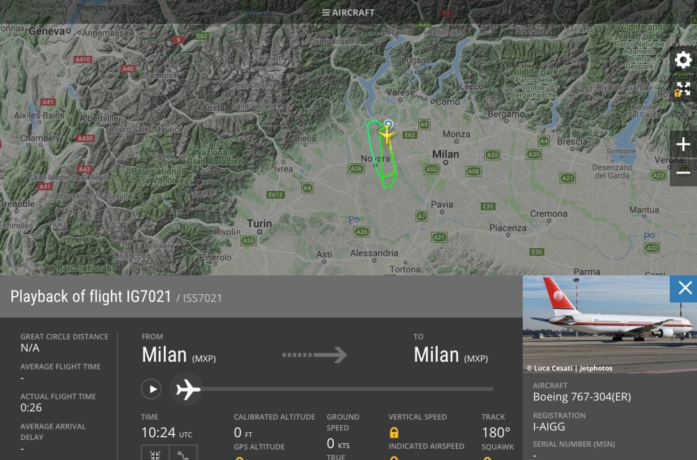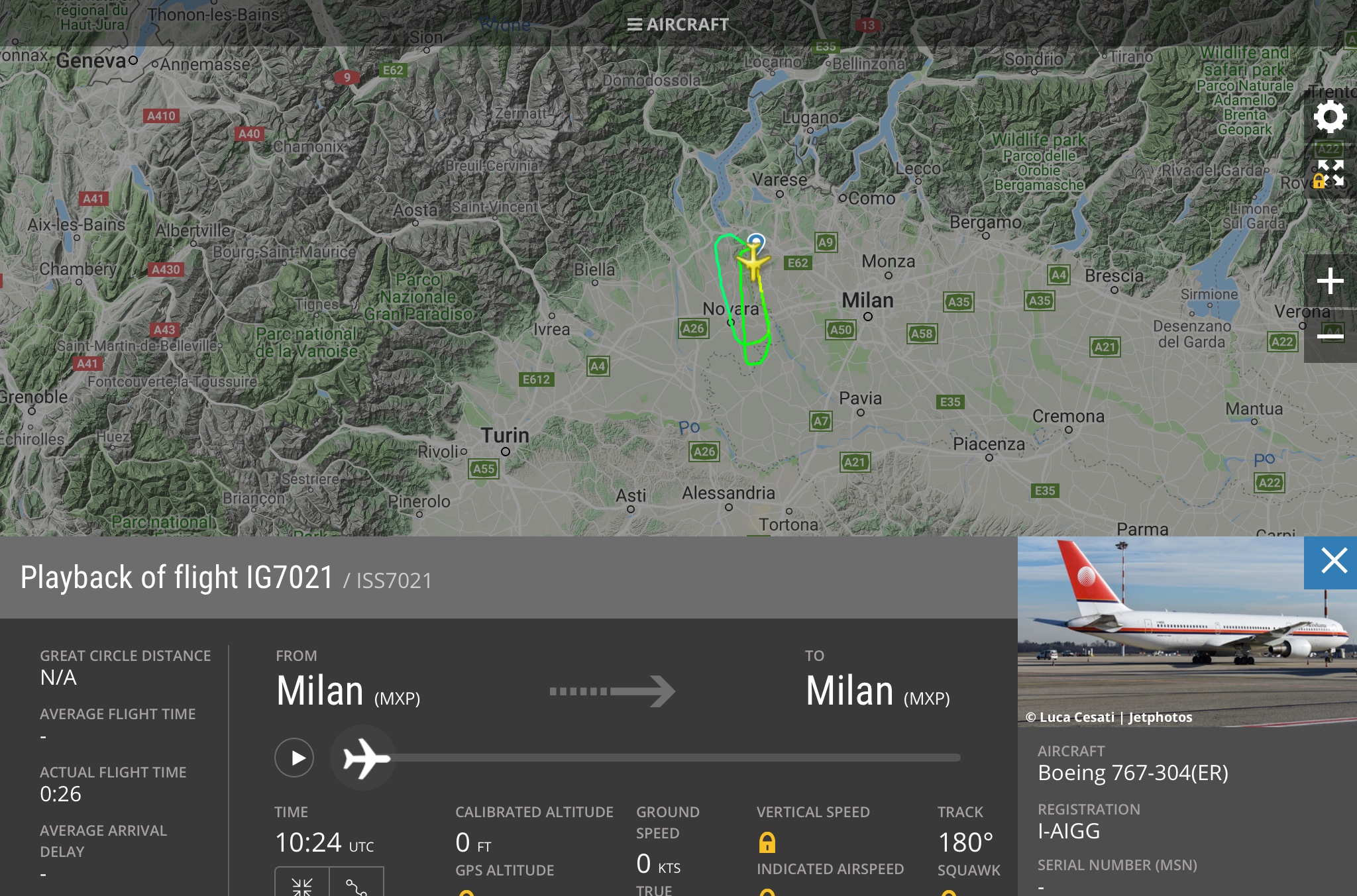 Poco più di venti minuti la durata del volo IG7021, l’ultimo di I-AIGG. Come si vede dal diagramma due circuiti, uno per il decollo e quindi un passaggio basso, al successivo un full stop.