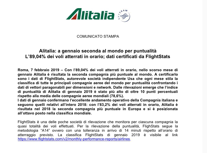 Flightstats ha certificato che Alitalia con il 89,04% e’ il secondo vettore più puntuale al mondo.